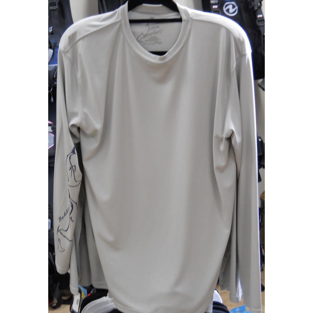 Hammerhead moving across the back of shirt of this shirt large. The head and fins are the same creative and graphic style of Bottom Crawlers. Note the number of gills on the hammerhead. Logo left chest. Soft touch artwork makes this lightweight, breathable UPF 50+ Solar Men's Shirt the best you will find. 4.1 oz, 100% microfiber polyester which keeps you safe, clean and looking good while doing everything you love. Bottom Crawlers, Shark Inspired Brand worth wearing. Diving, fishing, beach bumming, boating, or anything to do with water. It truly is a Water Thing. Our minimalist sophisticated style has been around for over 15 years. (155-SH-0003)
