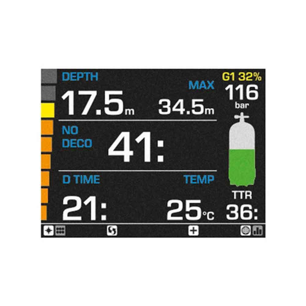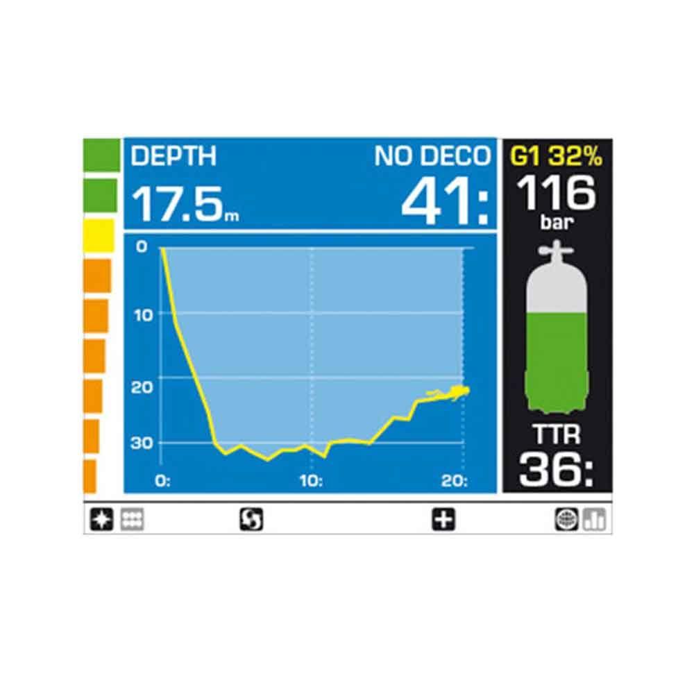 The Genius Scuba Dive Computer allows you to manage Trimix as well as Nitrox dives with gas changes. Thanks to the possibility of receiving data from 5 high-pressure probes, it allows integrated management of the gas supply, optimising both the bottom and decompression times according to the remaining gas. The Genius computer uses the ZH-L16C Decompression Algorithm with 16 fabrics with the ascent speed differentiated according to altitude and the possibility to modify the Gradient Factor to manage the shape of the decompression curve to your liking. Among the various parameters that can be modified is the possibility of selecting or omitting deep stops in order to limit the formation of micro bubbles. Among the various menus there is one with a bar graph, in which all the fabrics are represented in order of hemi-time, thus allowing an immediate awareness of the saturation level.