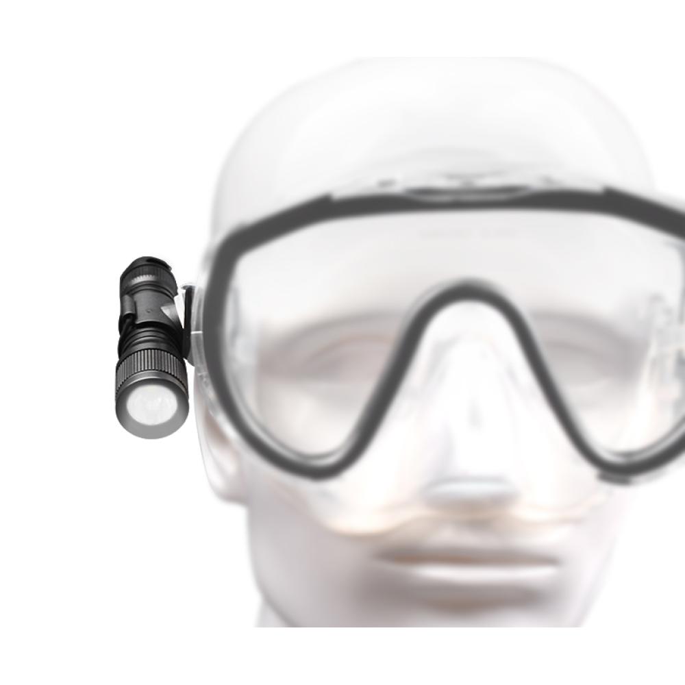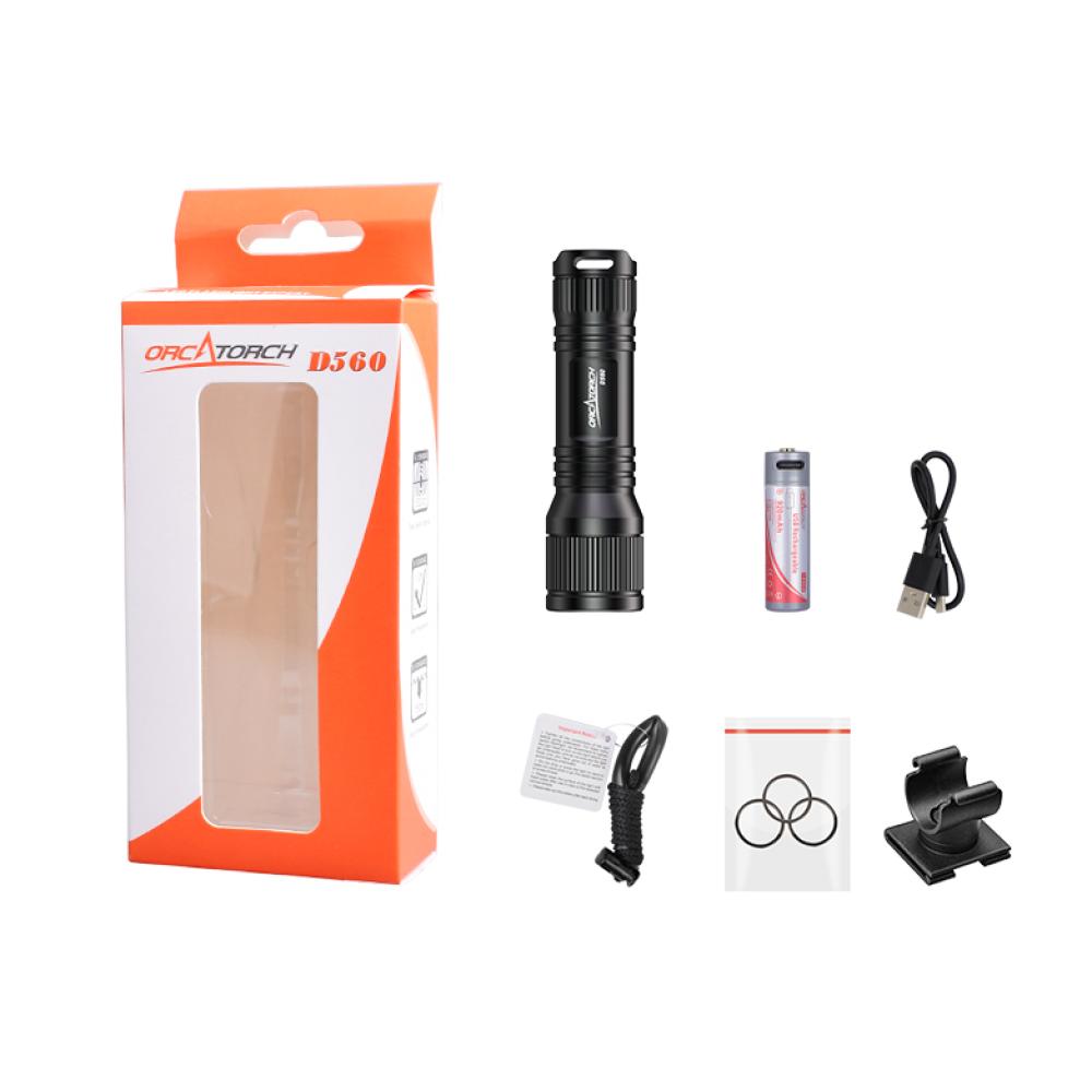 OrcaTorch D560 is a mini dive light with only 9 cm in length. Its max output can reach 700 lumens by using a single 14500 battery, and the longest runtime is 1h25min by using one AA battery. The light can rotate 360°angle with Orcatorch MX05 mask mount.
