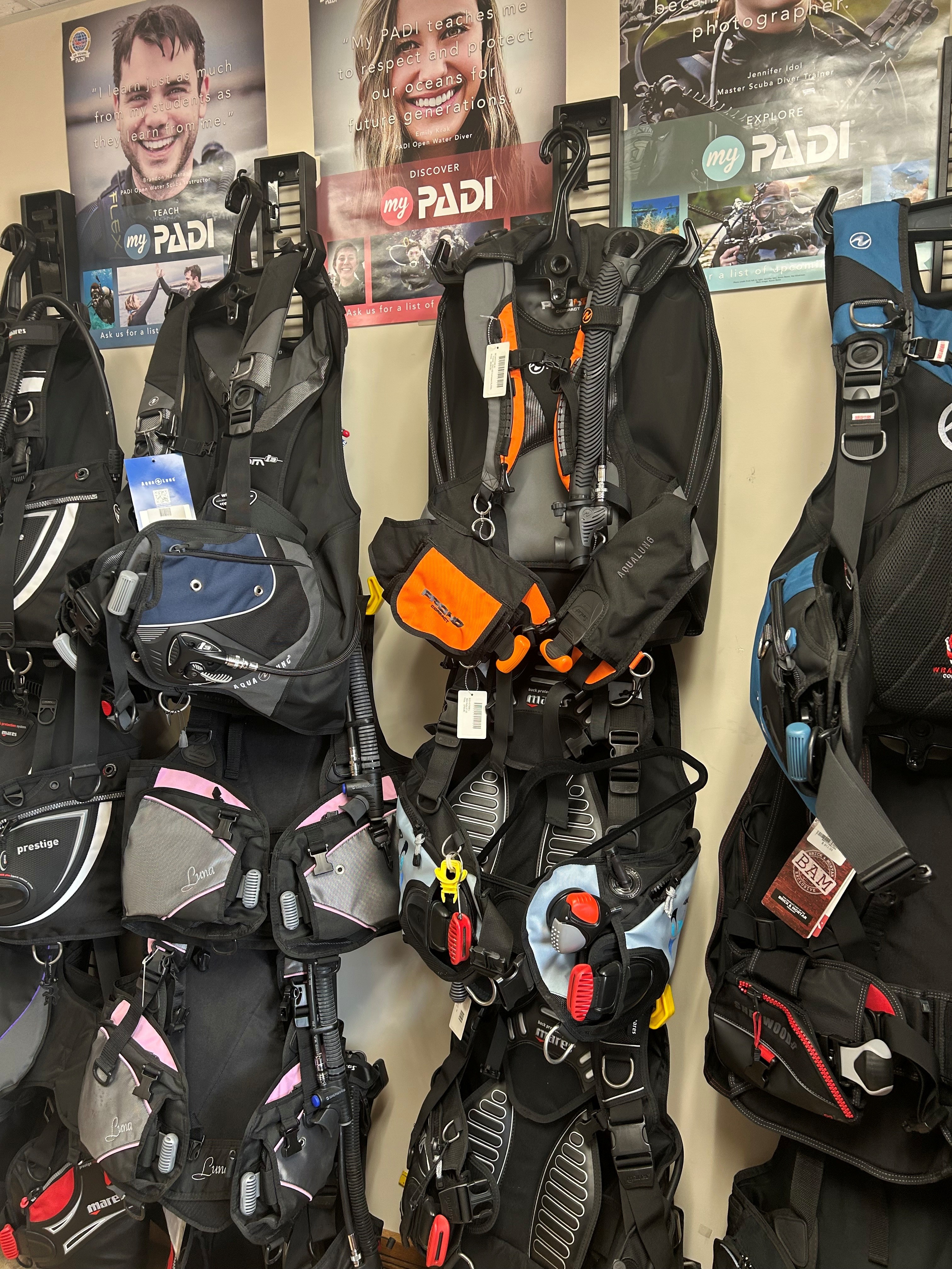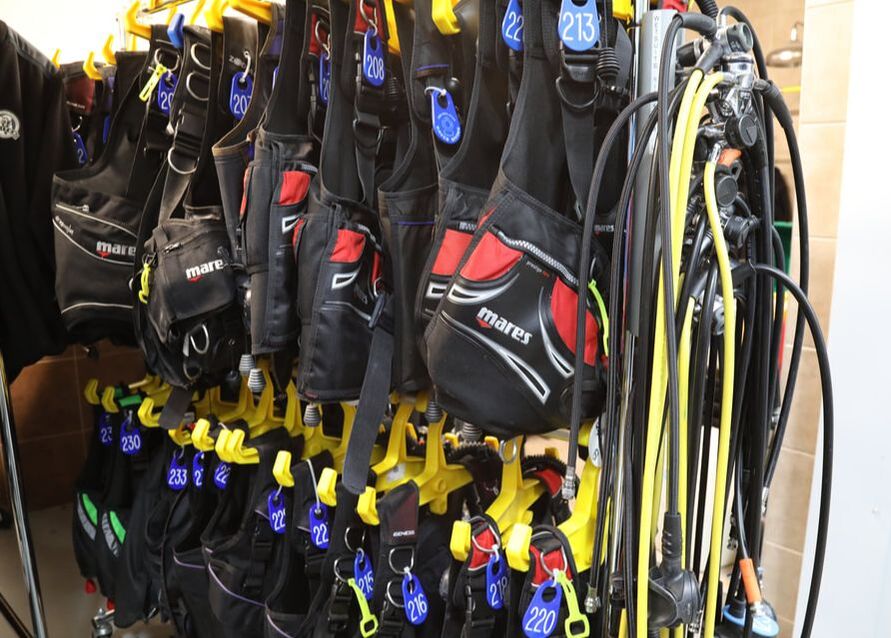 Our well stocked rental fleet of BCD's and regulators. All reg sets now come with dive computers.
